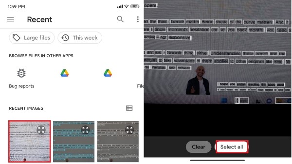 Bước 2: Chọn hình ảnh cần dịch từ thư viện > Bôi đen vùng cần thực hiện dịch > Ấn “chọn tất cả”.