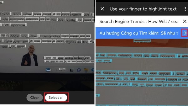 Bước 2: Chọn bôi đen ký tự cần dịch trên vùng đã quét > Ấn vào “chọn tất cả” > Chọn biểu tượng “mũi tên” để xem kết quả dịch.