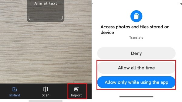 Bước 1: Chọn “Nhập” và cho phép Dịch truy cập ảnh, phương tiện và tệp dữ liệu trên thiết bị di động của bạn.