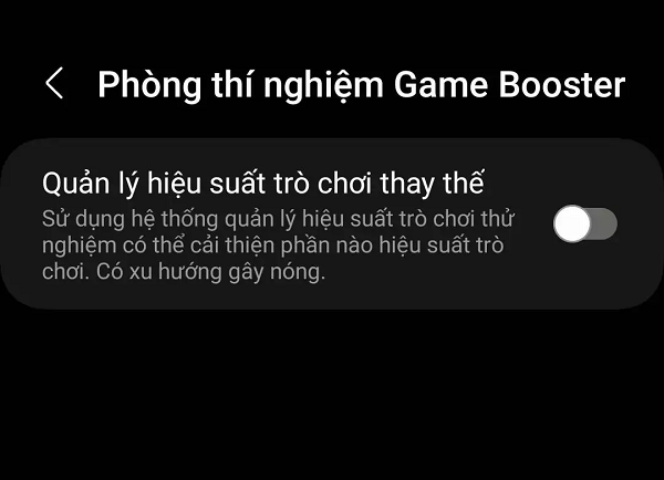 Bạn có thể thực hiện bằng cách truy cập vào mục Cài đặt Game Booster > Nhấn chọn Phòng thí nghiệm > Bật/Tắt chế độ Quản lý hiệu suất trò chơi thay thể nhằm mang lại trải nghiệ hợp với nhu cầu sử dụng.