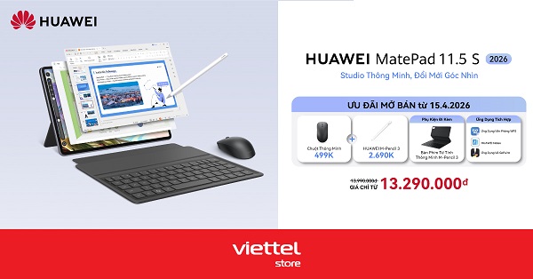Viettel Store chính thức khởi động chương trình mở bán của HUAWEI MatePad 11.5″ S, người dùng có cơ hội nhận nhiều ưu đãi hấp dẫn với quà tặng giá trị đi kèm như bút cảm ứng HUAWEI M-Pencil 3, chuột thông minh và các phụ kiện hỗ trợ học tập, làm việc tiện lợi. Chương trình không chỉ giúp tối ưu chi phí sở hữu mà còn mang đến trải nghiệm sử dụng trọn vẹn hơn ngay từ những ngày đầu, hỗ trợ người dùng khai thác tối đa khả năng sáng tạo và hiệu suất của thiết bị.