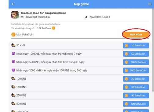 Bước 2: Chọn server và tên nhân vật tương ứng của game thủ, sau đó click “mua ngay” để nạp sohacoin.