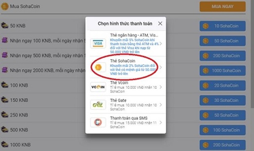 Bước 3: Chọn hình thức thanh toán là thẻ sohacoin.