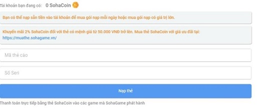 Bài viết này cũng sẽ hướng dẫn các bạn cách thức để nạp thẻ SohaCoin vào game. Bạn cần thực hiện các bước sau đây để nạp tiền game: