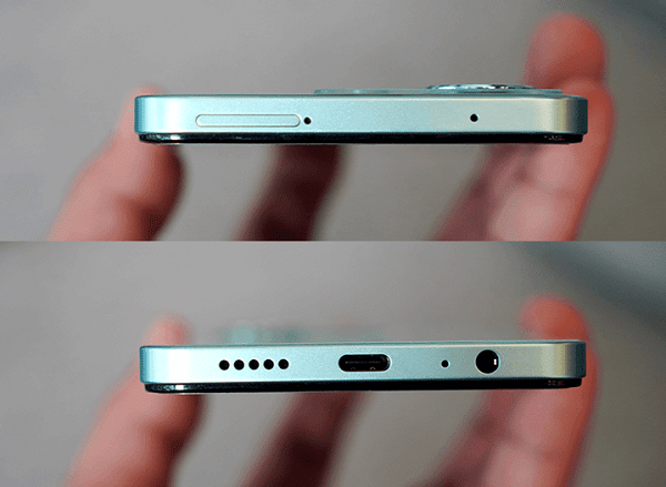 Các phím vật lý của Vivo Y36 cũng được bố trí ở những nơi giúp người dùng dễ thao tác. Cụ thể cạnh phải là nơi chứa nút nguồn kiêm cảm biến vân tay cùng cụm phím tăng/giảm âm lượng. Cạnh trái hoàn toàn trống trơn. Cạnh dưới là jack 3.5 mm, mic thu âm, cổng sạc USB-C và loa ngoài. Cạnh trên máy được bổ sung thêm một mic thu âm và khay SIM.