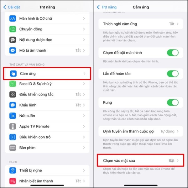 Bước 2: Trong giao diện Trợ năng, tìm phần Thể chất và vận động → Nhấn vào mục Cảm ứng → Sau đó chọn tính năng Chạm vào mặt sau.