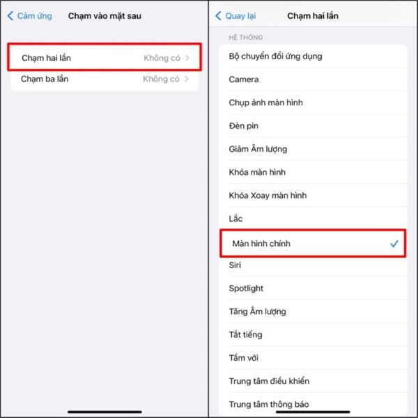 Bước 3: Tại màn hình tùy chỉnh, bạn có thể chọn hành động Chạm hai lần hoặc Chạm ba lần, tùy sở thích cá nhân. Gợi ý nên chọn Chạm hai lần để tiết kiệm thao tác. Cuối cùng, bạn chọn chức năng Màn hình chính để hoàn tất thiết lập.