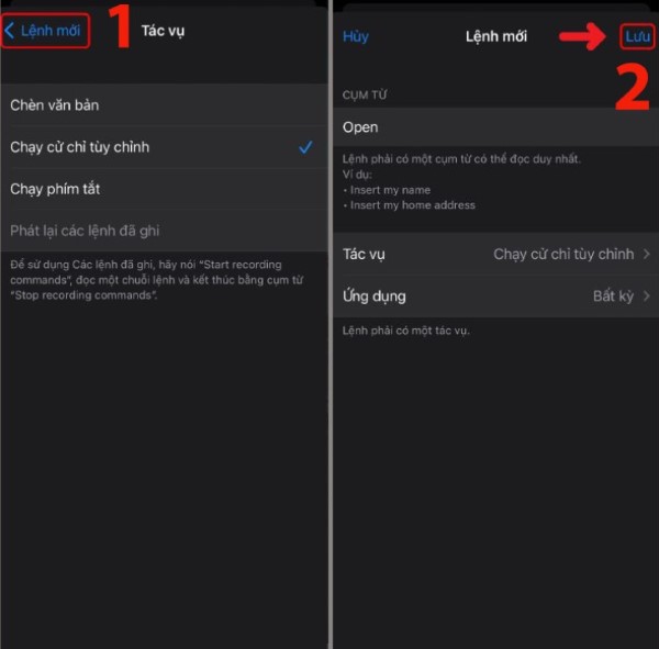 Lưu ý: Siri chỉ hỗ trợ các câu lệnh bằng tiếng Anh. Do đó, nên chọn từ ngắn gọn, dễ phát âm như “Open” để đảm bảo máy nhận diện tốt.