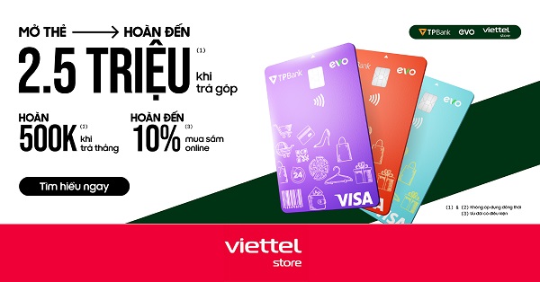 – Ưu đãi 2 – Áp dụng cho khách hàng thanh toán 100% giá trị đơn hàng: Hoàn tiền 20%, tối đa 500.000 VND cho giao dịch thanh toán đầu tiên bằng thẻ TPBank EVO tại hệ thống bán lẻ của Viettel Store trong trong vòng 30 ngày kể từ ngày thẻ được phát hành.