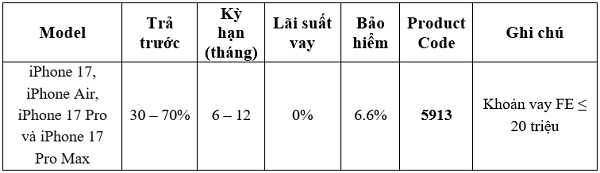 Các sản phẩm iPhone 17, iPhone Air, iPhone 17 Pro và iPhone 17 Pro Max đều chung code 5913 khi trả góp 0% qua FE.