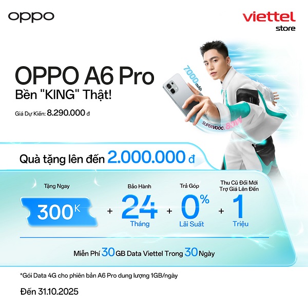 Sẵn sàng nâng tầm trải nghiệm cùng OPPO A6 Pro, siêu phẩm mới mang đến sự kết hợp hoàn hảo giữa thiết kế bền bỉ, hiệu năng mạnh mẽ và pin siêu khủng. Trong thời gian khuyến mãi đặc biệt ra mắt sản phẩm mới, khách hàng khi mua OPPO A6 Pro sẽ nhận ngay quà tặng hấp dẫn trị giá lên đến 2.000.000đ. Đây là cơ hội không thể bỏ lỡ dành cho những ai yêu thích một chiếc smartphone “bền king thật” cả về hiệu suất lẫn độ bền.