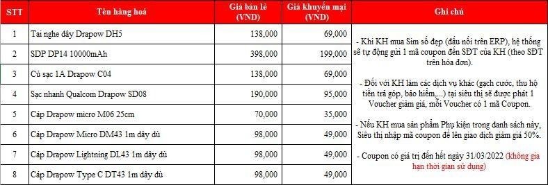 Danh sách các sản phẩm phụ kiện áp dụng giảm 50% khi mua SIM số đẹp: