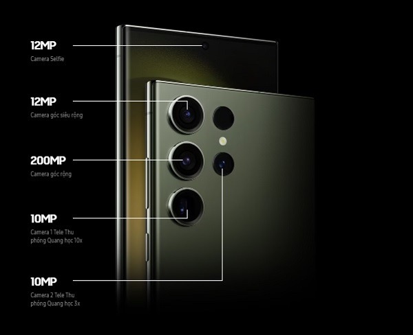 Điểm nổi bật nhất trong trong hệ thống camera của Galaxy S23 Ultra là cảm biến chính lên tới 200MP. Với độ phân giải khủng kết hợp công nghệ AI hiện đại, S23 Ultra bắt trọn mọi khoảnh khắc một cách sắc nét bất chấp mọi điều kiện ánh sáng. Bên cạnh đó máy còn có 3 camera phụ gồm: cảm biến góc siêu rộng 12MP và 2 cảm biến tele 10MP cho phép người dùng có thể chụp được mặt trăng.