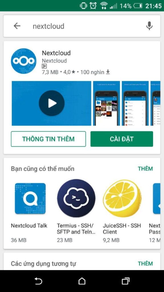 Vào thư viện ứng dụng Google Play và tiến hành tải Nextcloud.