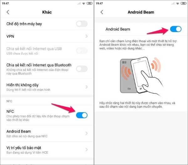 Để sử dụng tính năng NFC, trước tiên bạn chỉ cần mở chế độ NFC trên điện thoại lên. Sau đó, bạn chỉ cần chạm nhẹ điện thoại vào thiết bị cần kết nối cũng có tính năng NFC này. Ngoài ra, bạn cũng có thể sử dụng NFC theo cách thủ công như sau: