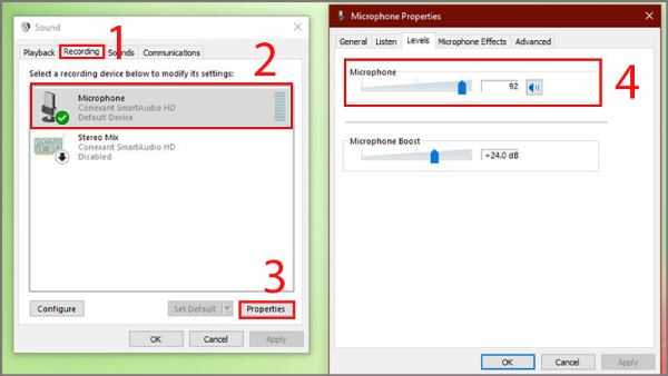 Sau đó, bạn chuyển tiếp sang tab Recording > chọn vào Microphone > nhấn chọn Properties > kéo trượt để di chuyển thanh trượt phía dưới micro lên mức cao hơn, đủ để mọi người tham gia Google Meet có thể nghe được.