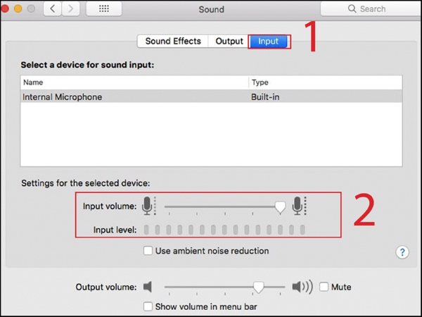 Bạn mở hộp thoại System Preferences bằng cách mở Apple menu > chọn System Preferences > nhấp vào Sound > chuyển tiếp sang tab Input > kéo thanh trượt để điều chỉnh âm thanh tại mục Input Volume.