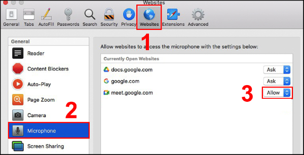 Còn đối với người dùng trình duyệt Safari trên Macbook, bạn đi tới Safari menu > chọn Preferences > nhấn vào tab Website > chọn Micro và đặt meet.google.com thành Allow.