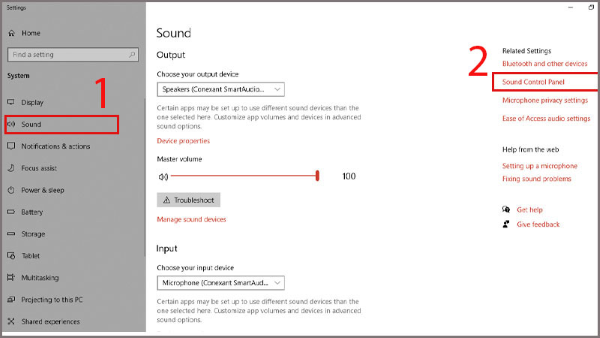 Bạn mở ứng dụng Windows Settings tại menu Start menu or Action Center > nhấn chọn System > chọn Sound > nhấn tiếp vào Sound Control Panel dưới mục Related Settings.
