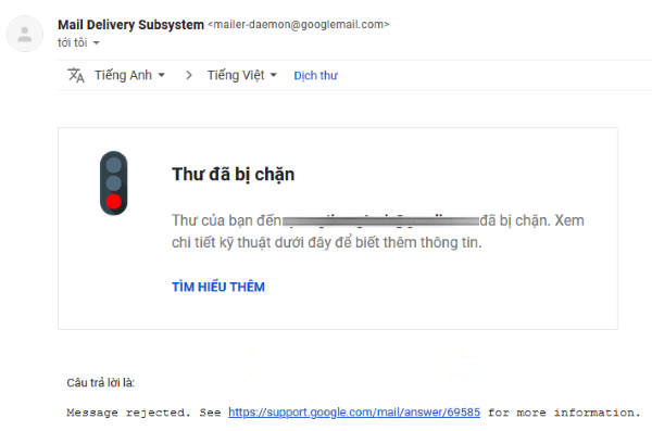 Trong trường hợp người gửi nhận được thông báo với nội dung “554 554 5.7.1 Service unavailable; Client host [74.125.82.47] blocked using dnsbl.sorbs.net; Currently Sending Spam See: http://www.sorbs.net/lookup.shtml?74.125.82.47 (state 14)” khi gửi mail cho một ai đó thì có nghĩa là địa chỉ IP của bạn đang nằm trong danh sách đen chặn mail của người nhận.
