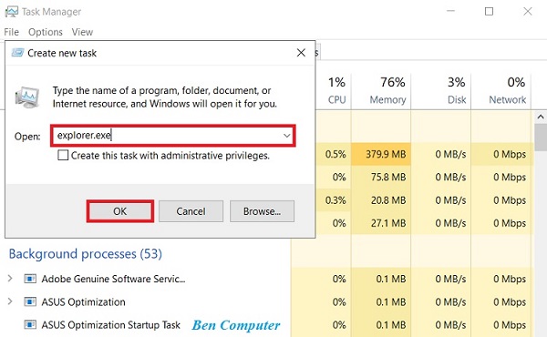 Bước 3: Khi thấy cửa sổ Create new task xuất hiện, hãy nhập lệnh explorer.exe vào ô rồi sau đó nhấn OK để hoàn thành.