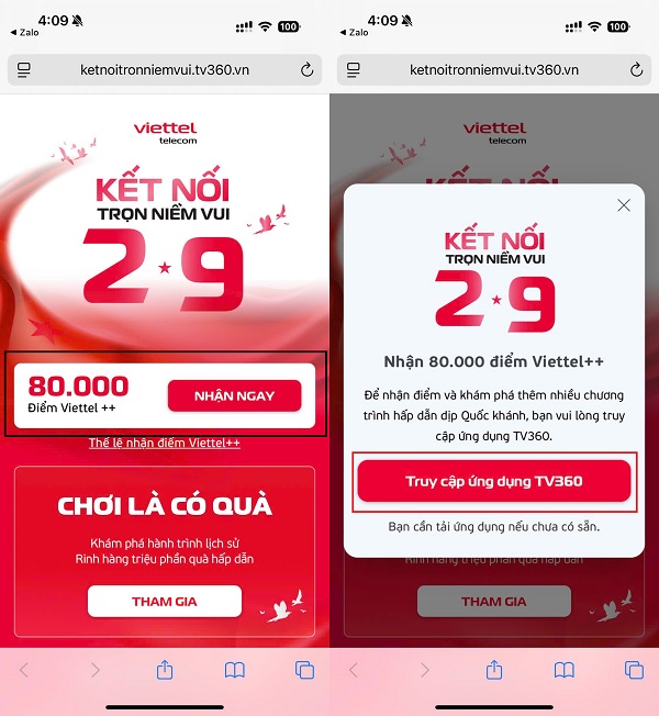 Bước 3: Tiếp theo, bạn chỉ cần truy cập vào đường link của chương trình ưu đãi TẠI ĐÂY và xác nhận tham gia để hệ thống cộng ngay 80.000 điểm Viettel ++ vào tài khoản của mình.