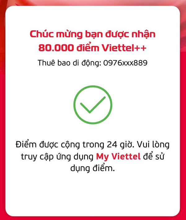 Bước 5: Khi màn hình xuất hiện thông báo nhận thành công, bạn hãy mở ứng dụng My Viettel để kiểm tra tài khoản. Tại đây, số 80.000 điểm sẽ được hiển thị và bạn có thể sử dụng ngay để đổi data, phút gọi hoặc các quà tặng, voucher hấp dẫn.