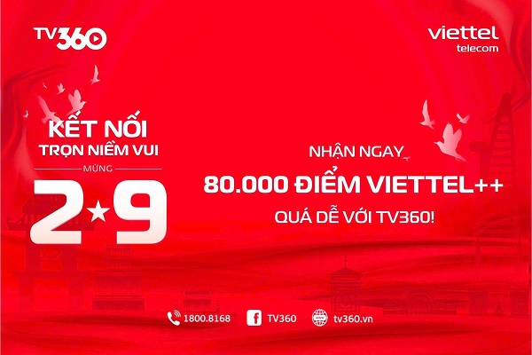 Chương trình tặng 80.000 điểm Viettel ++ được Viettel triển khai như một món quà tri ân đặc biệt gửi đến khách hàng nhân dịp kỷ niệm 80 năm Quốc khánh 2/9. Hãy thực hiện đầy đủ các bước để nhận điểm thành công, từ đó bạn có thể đổi lấy nhiều ưu đãi hấp dẫn trong hệ sinh thái Viettel++. Kính chúc bạn có một kỳ nghỉ lễ trọn vẹn và thật nhiều niềm vui.