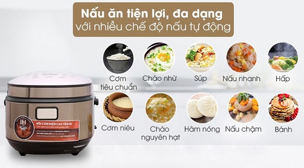 Đa chức năng: Nhiều mẫu nồi cơm điện cao tần còn có thêm những chức năng như hâm nóng, nấu cháo, hấp, nấu súp và nấu mì, tạo nên sự tiện lợi và linh hoạt hơn trong việc chế biến thực phẩm. Thậm chí, một số dòng sản phẩm còn có đến 11 đến 13 chế độ nấu khác nhau.