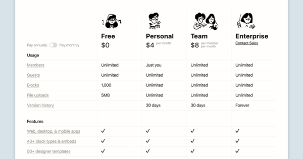 Notion cung cấp 4 gói để người dùng có thể lựa chọn theo nhu cầu gồm: