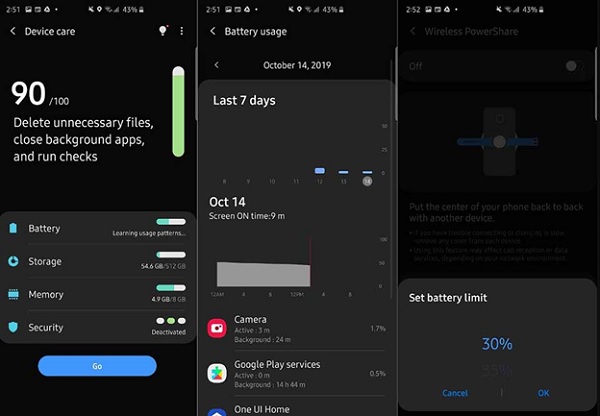 Ngoài ra, bạn có thể chọn cách ẩn thông tin sạc luôn xuất hiện trên màn hình và lưu lại trong phần Chăm sóc thiết bị với nhiều chỉ số pin chi tiết hơn. Với One UI 2.0, bạn có thể kiểm soát dễ dàng hơn việc sạc cho thiết thị khác, đồng thời cho phép tính năng sạc ngược không dây ở mức 90% nếu muốn (trước đó dừng lại 30% trên Adnroid Pie).