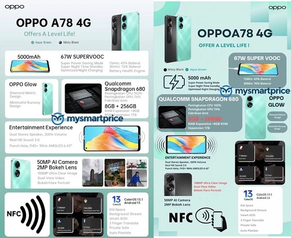 Theo nhiều nguồn tin rò rỉ, OPPO A78 sẽ có thiết kế thanh lịch, trẻ trung với mặt lưng Glow cùng thiết kế Diamond Matrix bóng bẩy. Sản phẩm này sẽ có hai tùy chọn màu sắc là Đen và Xanh.