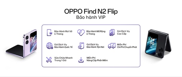 Khi sử dụng smartphone màn hình gập, ngoài độ bền màn hình, dịch vụ bảo hành cũng là một mối quan tâm lớn đối với người dùng. Hiểu được nhu cầu đó, bên cạnh các chính sách bảo hành cơ bản, OPPO còn đặc biệt cung cấp Gói Bảo hành V.I.P dành riêng cho Find N2 Flip, trong đó kể đến: