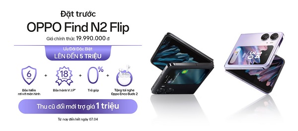 Sản phẩm OPPO Find N2 Flip chính thức được mở bán từ ngày 08/04/2023 tại tất cả các siêu thị Viettel Store trên toàn quốc. Là “tân binh” đầu tiên của OPPO gia nhập vào thị trường smartphone màn hình gập, với những nâng cấp công nghệ tốt nhất, Find N2 Flip có giá bán lẻ chính thức là 19.990.000 VNĐ, với hai phiên bản màu sắc thời trang: Tím Sương và Đen Khói.