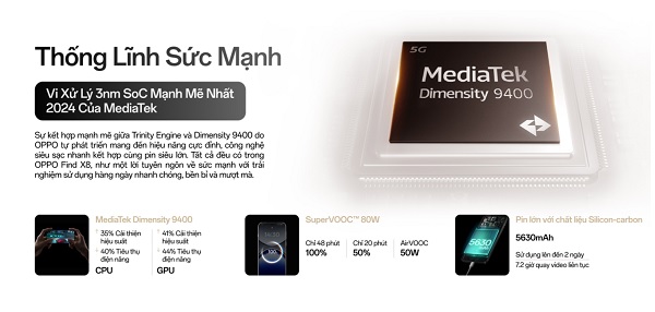 OPPO Find X8 được trang bị vi xử lý MediaTek Dimensity 9400, đạt hơn 3 triệu điểm AnTuTu cùng công nghệ Ray-Tracing được cải thiện vượt bậc, mang lại hiệu suất gaming cực cao. Điểm mạnh của con chip này là: