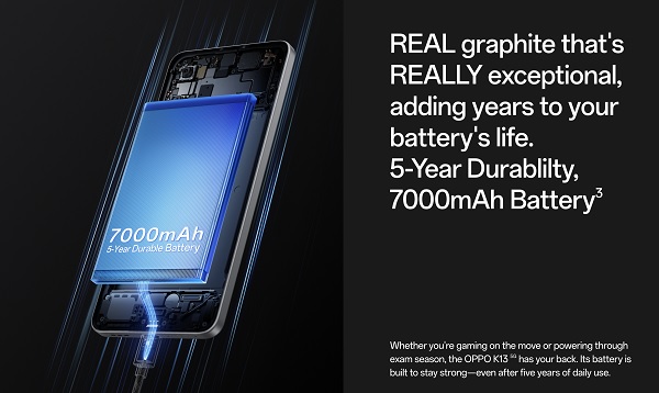 Về thời lượng pin, OPPO K13 sở hữu viên pin khủng 7.000 mAh, hỗ trợ công nghệ sạc nhanh 80W – một trong những tiêu chuẩn sạc nhanh hàng đầu hiện nay. Chỉ trong chưa đầy một giờ, người dùng đã có thể sạc đầy pin, giúp giảm đáng kể thời gian chờ đợi.