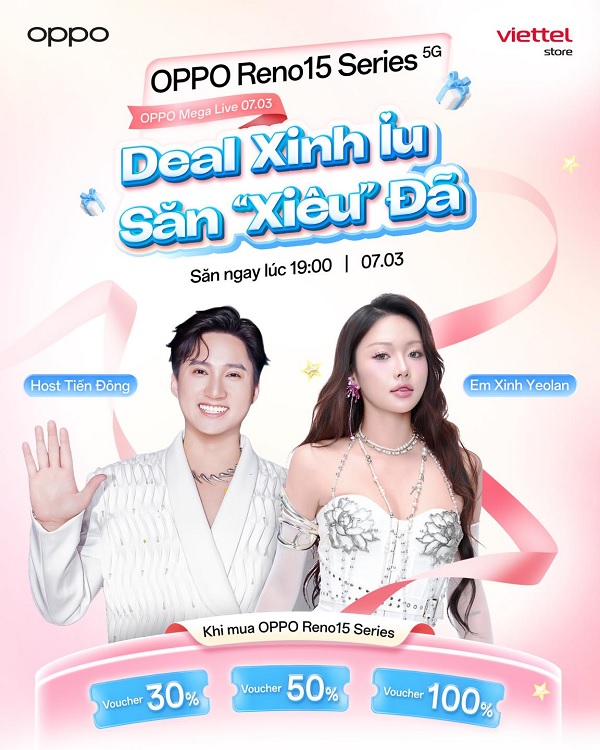 Tối nay, cộng đồng yêu công nghệ sẽ có cơ hội tham gia một buổi livestream cực kỳ sôi động với chương trình OPPO Mega Live: Deal xinh iu, săn “xiêu” đã diễn ra trên fanpage Viettel Store. Đây là dịp để người xem vừa giải trí, vừa tương tác trực tiếp và đặc biệt là săn những ưu đãi “hiếm có” dành cho dòng OPPO Reno15 Series.