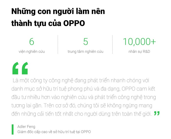 OPPO tin rằng các công ty công nghệ phải tự mình giải quyết các bài toán công nghệ để người dùng có thể tận hưởng cuộc sống dễ dàng và thuận tiện hơn. Đây từ lâu đã trở thành sứ mệnh cốt lõi của đội ngũ R&D OPPO – với hơn 10.000 nhân viên – nằm rải rác tại 6 viện nghiên cứu và 5 trung tâm nghiên cứu trải dài trên tất cả các lục địa lớn trên trái đất.