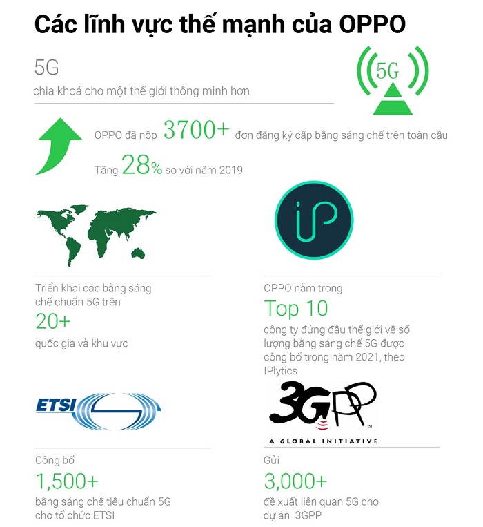 Với sứ mệnh góp phần phổ biến mạng 5G, OPPO đã nộp hơn 3.700 đơn đăng ký cấp bằng sáng chế đồng dạng toàn cầu, công bố hơn 1.500 bằng sáng chế toàn cầu về tiêu chuẩn 5G cho Viện Tiêu chuẩn Viễn thông Châu Âu (ETSI) và gửi hơn 3.000 đề xuất liên quan đến 5G cho dự án 3rd Generation Partnership Project (3GPP). Ngoài ra, theo báo cáo của viện nghiên cứu hàng đầu tại Đức, IPlytics, OPPO nằm trong số 10 công ty đứng đầu thế giới về số lượng bằng sáng chế 5G được công bố vào năm 2021.