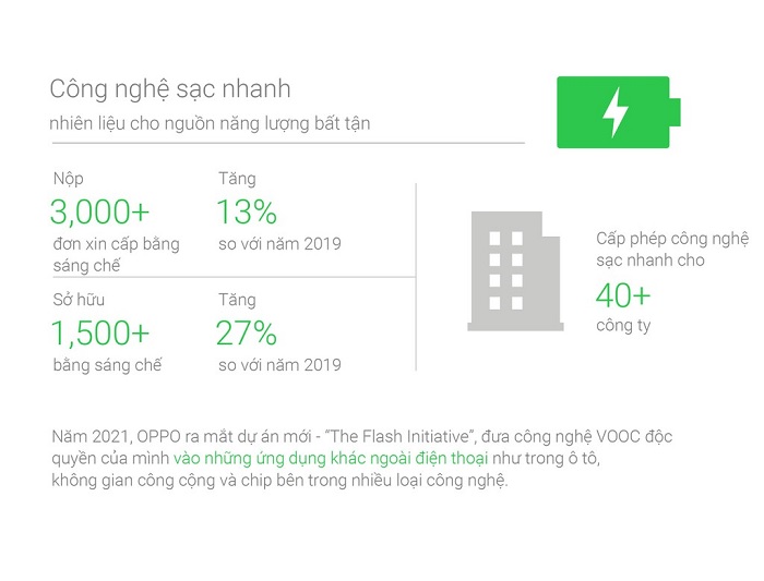 Công nghệ sạc nhanh là một điểm mạnh nổi bật khác của OPPO. Thương hiệu này đã đăng ký hơn 3.000 bằng sáng chế trên toàn thế giới, sở hữu hơn 1.500 bằng sáng chế đã được cấp và đã cấp phép công nghệ sạc nhanh cho hơn 40 công ty. Năm 2021, OPPO ra mắt dự án mới – “The Flash Initiative” (tạm dịch: Sáng kiến Công nghệ Sạc nhanh) đưa công nghệ VOOC độc quyền của mình vào ô tô, không gian công cộng và chip bên trong nhiều loại công nghệ.