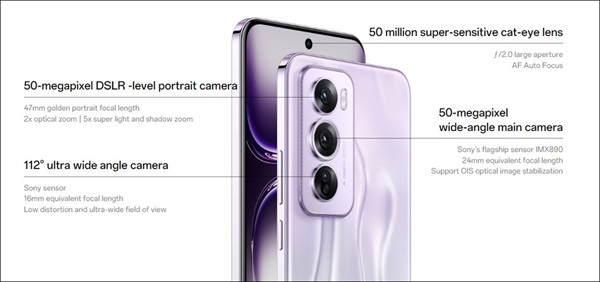 Hệ thống camera là một điểm nhấn sáng giá của Reno12 series. Trong đó, Reno12 Pro sở hữu camera chính Sony IMX890 50MP, camera tele 50MP hỗ trợ zoom quang học 2x cùng camera góc siêu rộng 8MP. Còn Reno12 có một vài điểm khác biệt với camera chính Sony LYT600 50MP, camera tele 50 MP hỗ trợ zoom quang học 2x và camera góc siêu rộng 8MP. Ở mặt trước, bộ đôi này đều sở hữu camera selfie 50MP.