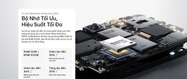Cung cấp sức mạnh cho Reno12 là con chip Dimensity 7300 Energy, kết hợp RAM LPDDR4X 12GB và bộ nhớ trong UFS 3.1 512GB, hỗ trợ mở rộng bộ nhớ lên tới 1TB thông qua khe thẻ nhớ microSD.