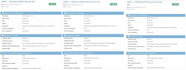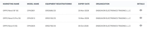 Ở Thái Lan, cơ quan NBTC đã phê duyệt ba thiết bị gồm Reno15, Reno15 Pro và Reno15 Pro Max; riêng Reno15 F vẫn chưa xuất hiện trong danh sách. Tuy nhiên, tại châu Âu (EEC), UAE (TDRA) và cơ sở dữ liệu TUV, ba mẫu Reno15, Reno15 F và Reno15 Pro đều đã đạt chứng nhận, còn OPPO Reno15 Pro Max lộ diện thì vẫn vắng bóng. Dữ liệu từ TDRA đồng thời xác nhận rằng toàn bộ các thiết bị trên đều hỗ trợ sạc nhanh 80W.