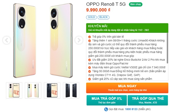 Giá bán chính thức của OPPO Reno8 T 5G phiên bản 128GB là 9.990.000 đồng. Ngoài ra, khi đặt mua tại Viettel Store từ nay đến 28/2/2023 bạn sẽ nhận được rất nhiều ưu đãi hấp dẫn, cụ thể: