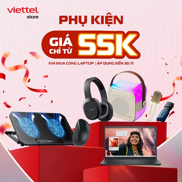 Mua laptop nay càng thêm lợi với chương trình ưu đãi phụ kiện giá chỉ từ 55K tại Viettel Store. Khi chọn mua bất kỳ mẫu laptop nào, khách hàng có thể sở hữu ngay chuột, loa, tai nghe Bluetooth, quạt tản nhiệt laptop và nhiều phụ kiện công nghệ khác với mức giá siêu tiết kiệm. Đây là cơ hội tuyệt vời để bạn hoàn thiện bộ thiết bị học tập và làm việc trọn gói, vừa tiện lợi vừa tối ưu chi phí.
