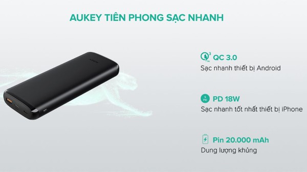 Pin dự phòng Aukey sử dụng công nghệ sạc nhanh Power Delivery (PD) và Quick Charge 3.0, giúp việc nạp năng lượng cho các thiết bị diễn ra nhanh chóng, tiết kiệm thời gian đáng kể so với các loại pin thông thường. Công nghệ này giúp cung cấp điện áp ổn định và an toàn, bảo vệ thiết bị của bạn khỏi những rủi ro khi sạc nhanh.