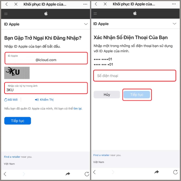 Bước 1: Thực hiện thao tác truy cập vào địa chỉ cho phép khôi phục ID Apple để tiến hành tìm lại mật khẩu của ID Apple > Thực hiện nhập ID Apple > Nhập các vào ô các ký tự trong ảnh > Nhập số điện thoại sử dụng trên thiết bị của bạn> Chọn vào phần Tiếp tục.
