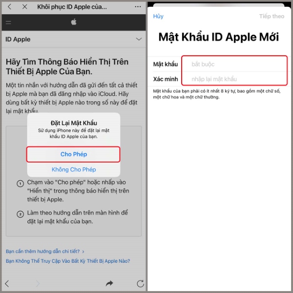 Bước 2: Ấn vào tùy chọn cho phép > Lúc này chúng ta tiến hành nhập Mật khẩu ID mới > Cuối cùng là chọn Xác minh thông tin.