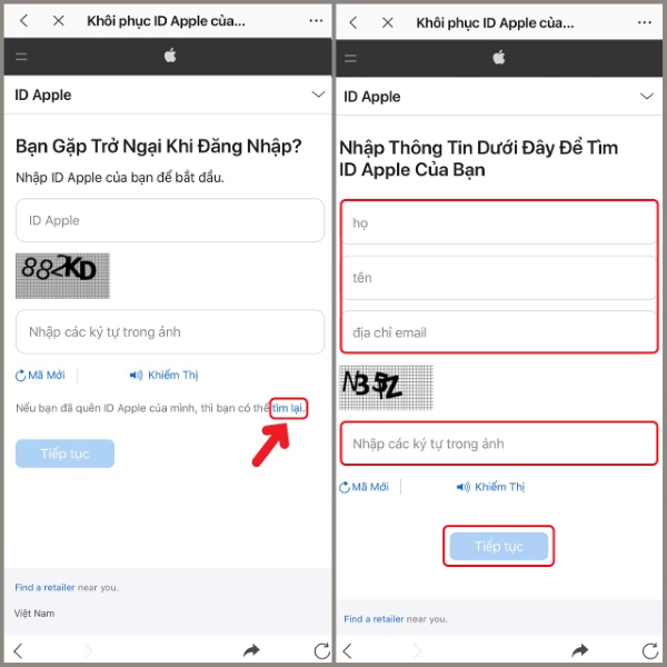 Bạn thực hiện truy cập vào địa chỉ cho phép Khôi phục ID Apple để có thể tiến hành tìm lại thông tin tài khoản của mình > Chọn vào mục Tìm lại > Tại đây chúng ta nhập các thông tin cá nhân như họ tên, Email để giúp tìm thông ID Apple thuộc sở hữu của bạn > Nhập các ký tự hiển thị trong ảnh > Chọn vào mục Tiếp tục để có thể lấy lại thông tin.