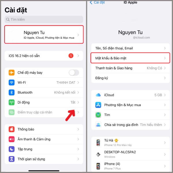 Bước 1: từ giao diện chính chọn vào mục Cài đặt > Chọn tên của thiết bị iPhone > Ấn vào mục Mật khẩu & Bảo mật.